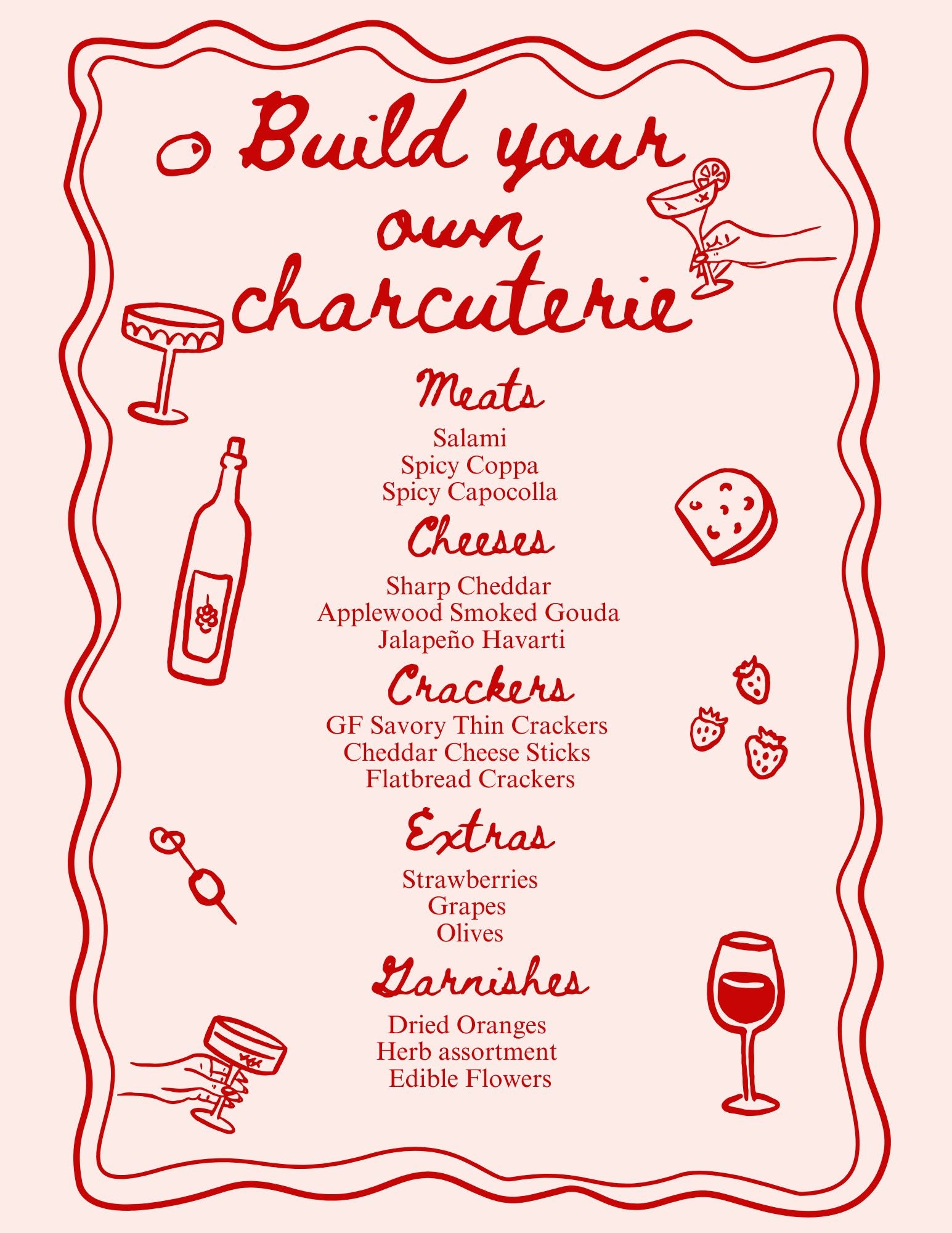 Included in the photos is a sample menu with 3 meats, 3 cheeses, and 3 accompaniments All current offerings are fully customizable (pricing may vary based on your selections.)